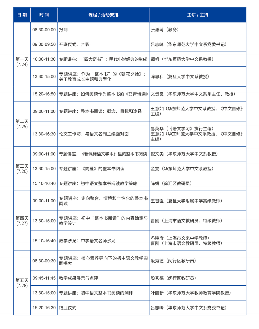在初中语文“整本书”阅读的教学板块,邀请了复旦大学附属中学高级教师王召强老师主讲“走向整合、情境和个性化的整本书阅读”,大象传媒 王意如教授主讲“整本书阅读:概念、目标和途径”,华东师大大象传媒 倪文尖教授主讲“《新课标语文学本》里的整本书阅读”,上海市徐汇区教育学院初中语文教研员陈妍老师主讲“初中语文整本书阅读教学策略”,上海市教育委员会教学研究室初中语文教研员曹刚老师主讲“初中‘整本书阅读’的内容确定与教学设计”,大象传媒 教师教育学院叶丽新教授主讲“初中语文整本书阅读的测评等讲座”,并安排了一场教学沙龙,邀请上海市文来中学教师、闵行区骨干教师冯晓彦老师做示范说课,由上海市教育委员会教学研究室初中语文教研员、语文特级教师曹刚老师进行点评,学员们一起讨论。通过以上主题讲座,学员与名师教授近距离交流,更好地认识、理解和把握教材。