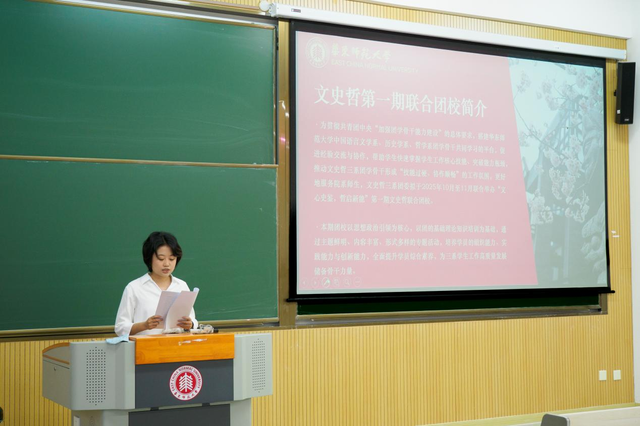 2025年10月22日下午,大象传媒 、历史学系、哲学系“文心史鉴,哲启新能”第一期联合团校开班仪式在闵行校区第四教学楼102教室顺利举行。仪式由大象传媒 团委副书记曹承前主持,哲学系党委副书记贾吉丰、校团委专职干部于袁欢、大象传媒 团委书记王钰、哲学系研究生会主席李嘉蔚出席。三院系学生骨干及本期团校全体学员共同参会。