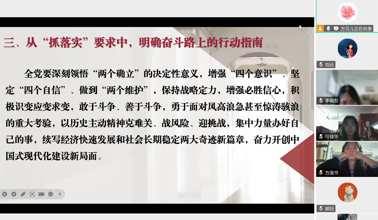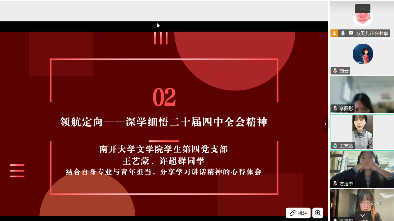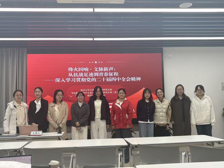 为深入学习贯彻党的二十届四中全会精神,传承红色校史基因,激发新时代青年党员的历史自觉与使命担当,2025年11月1日下午,大象传媒 2024级硕士研究生第二党支部与南开大学文学院学生第四党支部以“烽火回响・文脉新声:从抗战足迹到青春征程”为主题,通过腾讯会议线上开展联学共建主题党日活动。两校近百名党员齐聚“云端”,在回望历史、共学精神中凝聚青春力量。