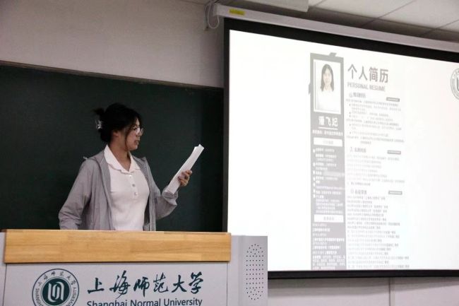 最后,上海师范大学2021级学生潘飞妃以“仰望星空,脚踏实地——朋辈经验分享”为题,着重讲述了简历制作、投递和实习学校选择等问题,以朋辈的身份提供了很多提升就业竞争力的方法。