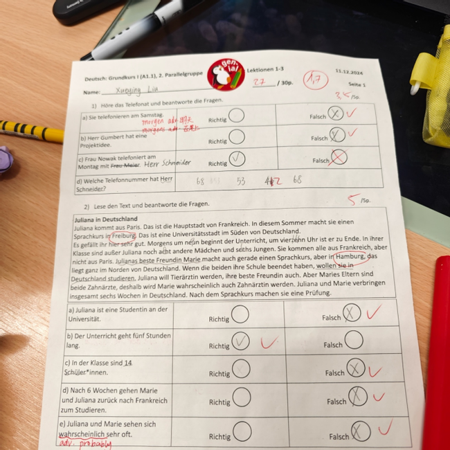 在德语学习方面,因为是从A1.1开始学起,一切都比较顺利。我在出发前已经自学过一些德语,但要说真正入门则还是在特里尔的课堂上。老师的答疑解惑和课堂上的交流实践,使我对德语有了更深刻的感知。我也在这个过程中结识了一位来自中国的同学,我们相互帮助、共同学习,在生活中也成为了朋友。除此之外,令我惊喜的是在期中和期末考试中拿到了全班第一,虽然这只是语言课的测验,但仍然让我备受鼓舞。