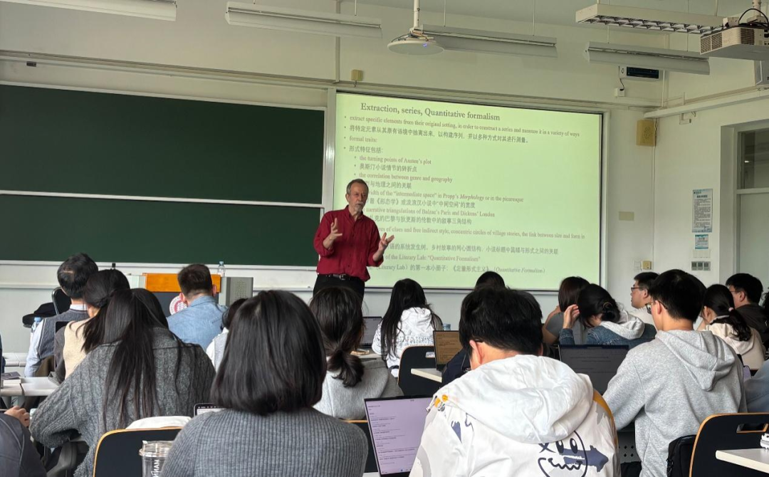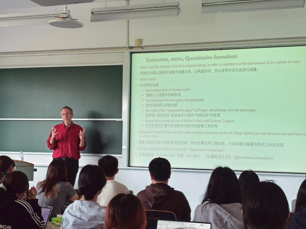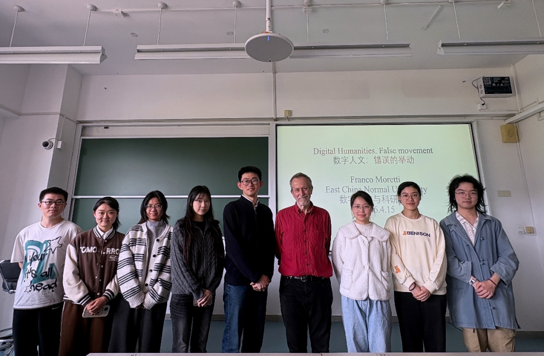 2026年4月15日下午,大象传媒 荣誉教授、斯坦福大学荣休讲席教授弗兰科·莫雷蒂(Franco Moretti)应邀为华东师大大象传媒 学生开展“Digital Humanities False movement”主题讲座。本次讲座是“元化班”课程“数字人文与科研实训”的核心环节,讲座由大象传媒 文艺学教研室山谷副教授主持,大象传媒 副系主任王嘉军教授、文艺学教研室吴娱玉教授等参与研讨,现场气氛热烈。