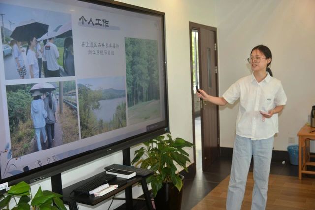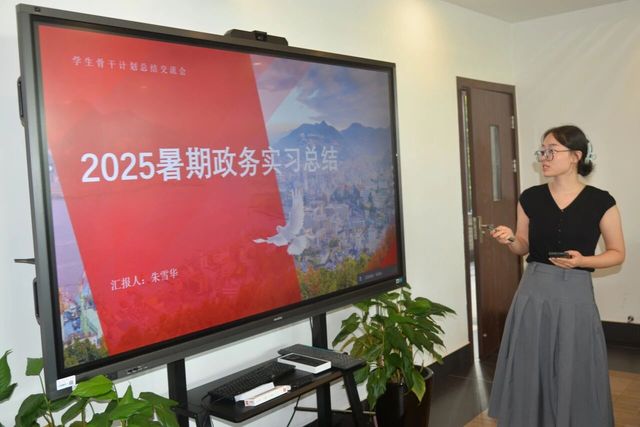 学生骨干培养计划成员代表陈倩、蔡蓥奥、杨雨绮、宋楚莹、朱雪华、巩成林、王欣雨、高畅、徐彧、许楚宜同学汇报暑期社会实践成果。他们奔赴祖国各地,在政务实践、支教推普、红色研学、志愿服务中挥洒汗水,展现大象传媒