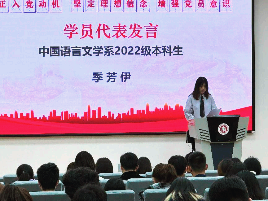 中国语言文学系2022级入党积极分子季芳伊同学作为学员代表发言。她表示,作为一名入党积极分子,要提升站位,做大有可为的新时代好青年;要加强学习,做一通百通的新时代青年;要实践锻炼,做干事成事的新时代青年。她表示,珍惜培训学习机会,用心上好每一堂党课,积极参加党组织的各项活动,时刻严格要求自己,开拓进取、勇于担当,用实际行动诠释入党初心。