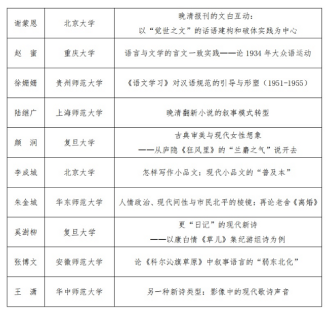 闭幕式于人文楼4430教室举行,大象传媒 中国现当代文学专业博士生张炎担任主持。张炎对与会嘉宾的恳切指点与同学们的积极参与表示了感谢。接着给冯凰、胡晓敏、李晓、李成城、马上、牛原、孙浩、王潇、王晨雪、王玥琳、谢蒙恩、颜润等获得“优秀论文奖”的十二位同学颁发获奖证书。北京大学谢蒙恩同学、宁夏师范大学孙浩同学发表获奖感言,他们分享了自己学术研究的经验,并对会议主办方表示了感谢。